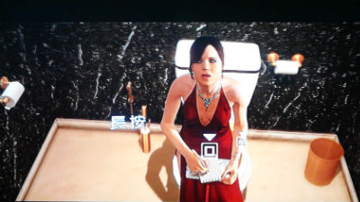 隨意走動(dòng),走進(jìn)一個(gè)有假瀑布?jí)吷系膸?,然后到最后一個(gè)坑位里,坐上馬桶打開手提包拿出筆記本(這里所有操作都是由右搖桿完成)“艾登,艾登你準(zhǔn)備好了嗎?”朱迪自言自語(yǔ)道“樓上的房間里有一張很大的畫,保險(xiǎn)箱就在它后面,我們要的文件就在里面,不過那里有很多攝像機(jī),你必須小心行事,知道了嗎?”