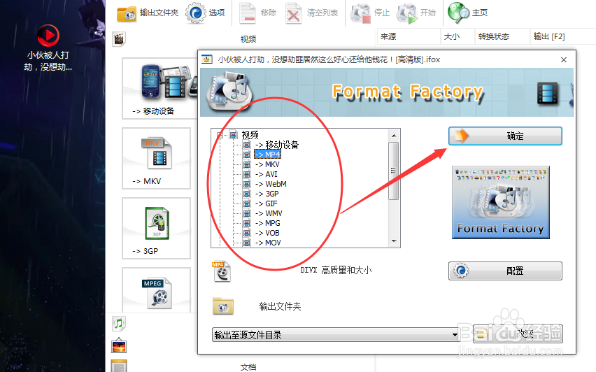 我們把視頻素材直接拖動到任務(wù)欄上,選擇要轉(zhuǎn)出的視頻格式,點擊確定,這里就以常見的mp4格式為例。