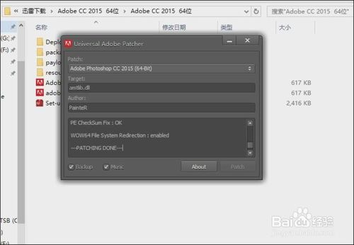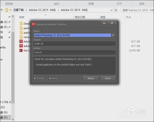 找到Adobe photoshop CC 2015 注意區(qū)分 64BIT 32BIT,自己安裝的還是自己清楚這里就不說了。選擇好之后點擊patch修復(fù)。
