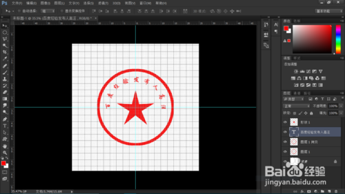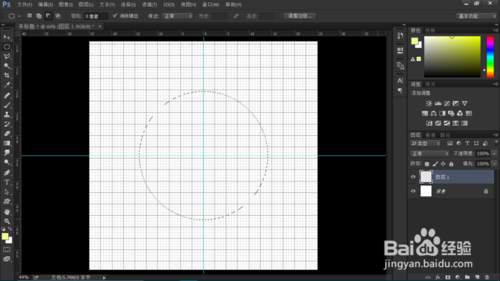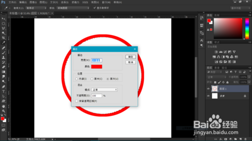 新建圖層一,拉出水平和垂直參考線,用橢圓選框工具按住Shift拉出正圓。將前景色設(shè)為紅色。右鍵選取,調(diào)出描邊,將寬度值改為28。