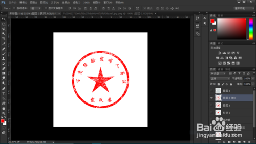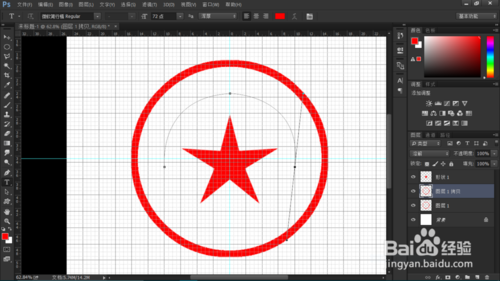 【Ctrl】+【J】復(fù)制圖層1,將其模式改為溶解。選擇自定義形狀工具,選擇五角星。放到圓的正中心,填充紅色