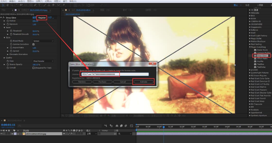2、打開AE軟件使用插件,輸入序列號(hào)注冊(cè)碼