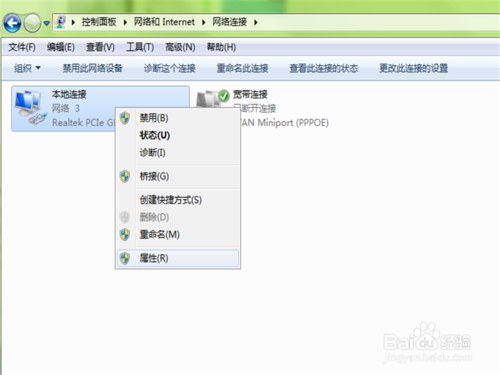 2、然后找到我們的本地連接,鼠標(biāo)右鍵點(diǎn)擊一下,然后選擇屬性并且點(diǎn)擊進(jìn)入到具體設(shè)置。