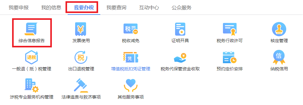(一)成功登錄后,進(jìn)入企業(yè)辦稅模式,選擇相應(yīng)企業(yè)后,在右側(cè)功能表中選擇“我要辦稅”標(biāo)簽,單擊“綜合信息報(bào)告”,左側(cè)菜單打開綜合信息報(bào)告菜單,默認(rèn)顯示“身份信息報(bào)告”。