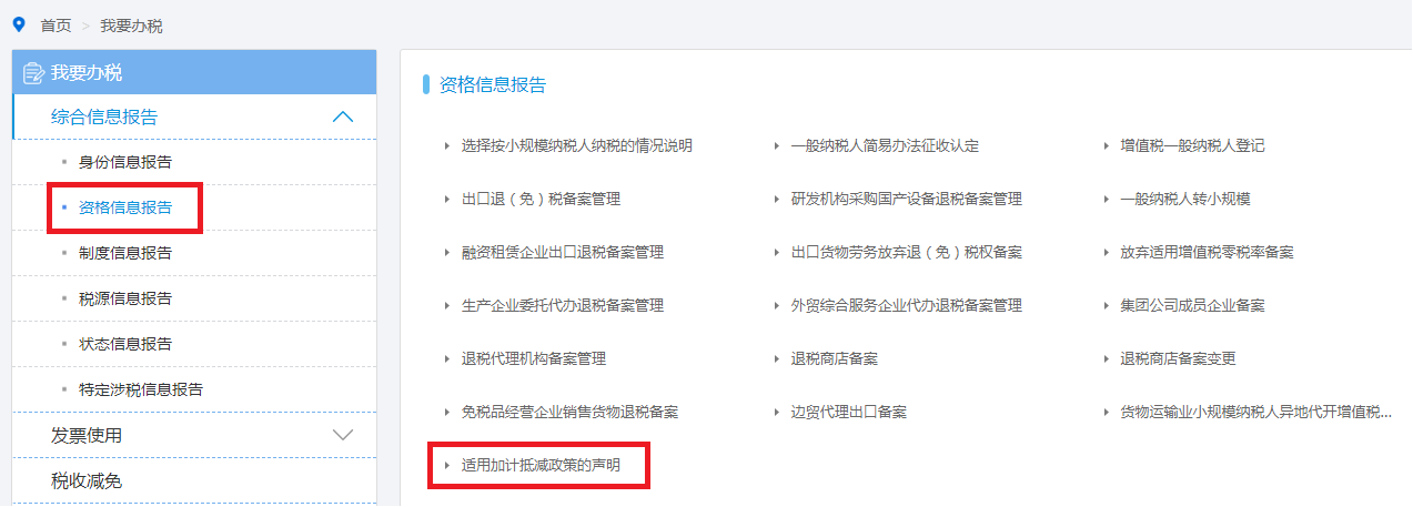 (二)在左側(cè)綜合信息報(bào)告菜單中,單擊【資格信息報(bào)告】菜單,右側(cè)顯示資格信息報(bào)告業(yè)務(wù)功能表,單擊【適用加計(jì)抵減政策的聲明】,進(jìn)入“填寫申請表”頁面。