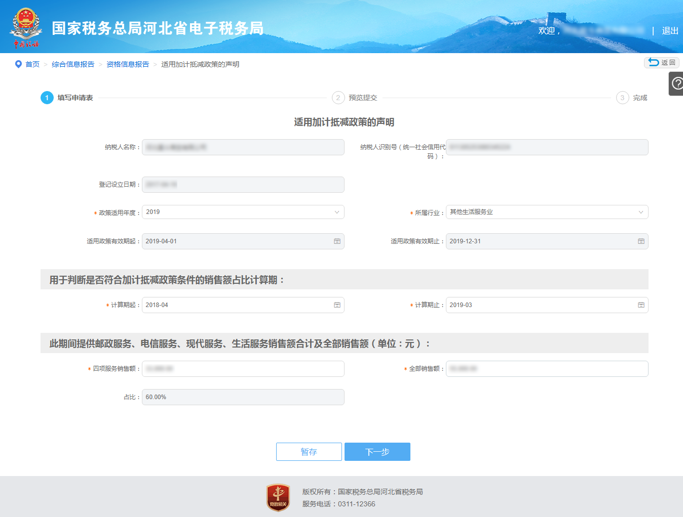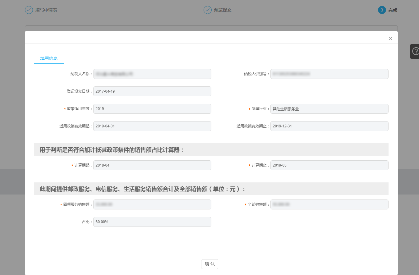 正確選擇或填寫:政策適用年度(不能選擇重復(fù)的適用政策年度,若選擇重復(fù),則彈出下圖提示)、所屬行業(yè)、適用政策有效期起和止、計(jì)算期起和止、四項(xiàng)服務(wù)銷售額、全部銷售額。點(diǎn)擊【暫存】按鈕,可將填寫信息成功暫存于系統(tǒng)中,點(diǎn)擊【下一步】按鈕,進(jìn)入“預(yù)覽提交”頁面。