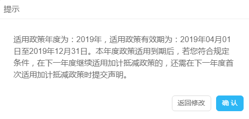 3、點(diǎn)擊提示中的【返回修改】按鈕,返回“填寫申請表”頁面,可對申請信息進(jìn)行修改;點(diǎn)擊提示中的【確認(rèn)】按鈕,提示“聲明內(nèi)容提交保存后,將不能修改,您是否確定提交?”,點(diǎn)擊【確認(rèn)】按鈕,提交適用加計(jì)抵減政策的聲明。
