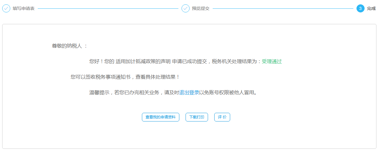 1、成功提交“適用加計(jì)抵減政策的聲明”后,受理通過。