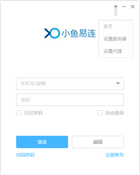 5、點(diǎn)擊登錄窗口右上角的“倒三角”按鈕,可以查看“關(guān)于”、“設(shè)置服務(wù)器”、“設(shè)置代理”。