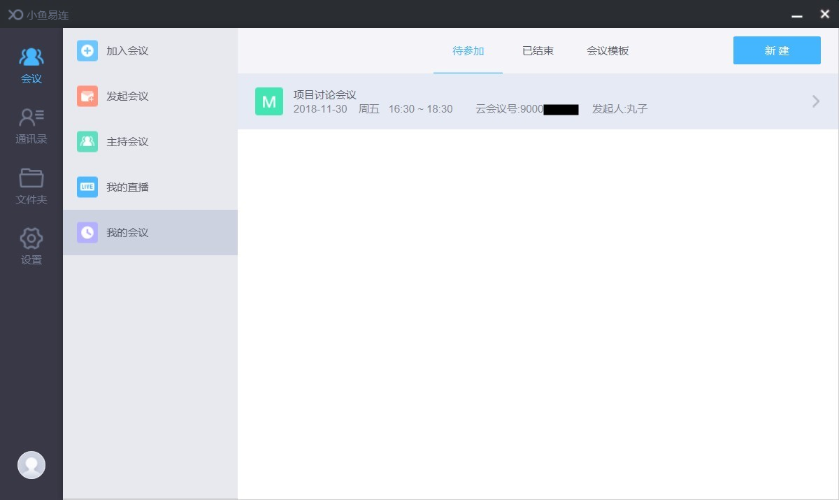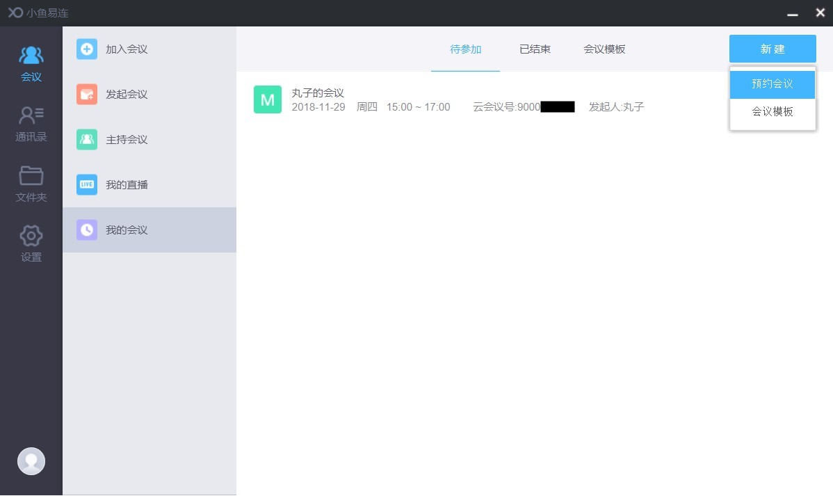 6、點(diǎn)擊頁面右上角的“新建”—“預(yù)約會議”按鈕,即可發(fā)起新的會議預(yù)約,也支持安排周期會議。