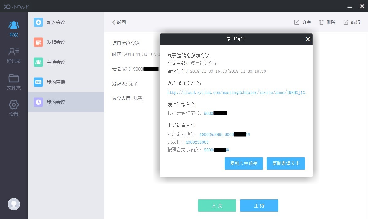 8、點(diǎn)擊列表里上面的會議,即可查看會議詳情,或進(jìn)行更多操作(如進(jìn)入會議、主持會議、分享、刪除、編輯等),點(diǎn)擊“分享”彈出分享會議頁面;“復(fù)制入會鏈接”或“復(fù)制邀請文本”發(fā)送給參會方,參會方可通過入會鏈接等方式進(jìn)入會議室。