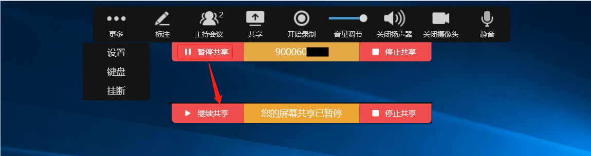 3、內(nèi)容共享時(shí)支持全功能工具欄: 一層為共享狀態(tài)指示(正在共享屏幕)+停止共享、繼續(xù)共享按鈕; 另一層為通話中的所有功能。