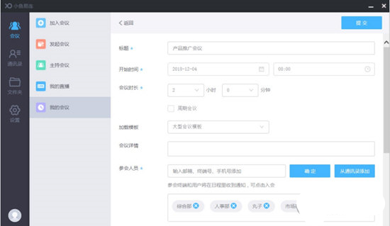 點(diǎn)擊“會議”-“我的直播”,右側(cè)界面顯示與用戶相關(guān)的直播列表。點(diǎn)擊右上角“新建直播”按鈕,用戶可以新建一個(gè)直播。填寫直播時(shí)間、標(biāo)題等信息,點(diǎn)擊“提交”按鈕,即可完成 。