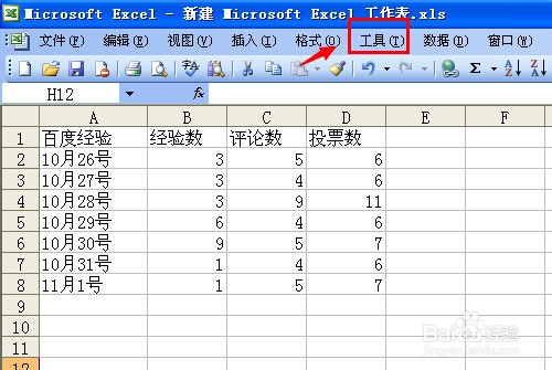 打開2003版本的excel表格,需要設(shè)置excel的密碼時可以點擊頂部主菜單中的“工具”菜單。(如下圖)