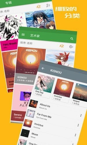 2、自動(dòng)導(dǎo)入、分類音樂,自動(dòng)添加SD卡和手機(jī)內(nèi)存中的所有的本地音樂庫/本地音頻文件,并通過歌曲、專輯、藝術(shù)家進(jìn)行播放列表、播放列隊(duì)分類,讓您的音樂瀏覽搜索更加便捷。
