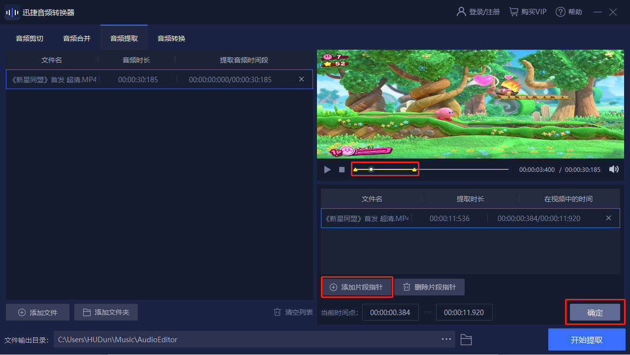 當(dāng)我們將音頻添加到軟件中后,如果大家不是想要提取整個(gè)視頻的音頻,我們可以點(diǎn)擊【添加片段指針】,通過調(diào)整指針位置,截取我們想要提取的音頻位置。在我們調(diào)整完成后,點(diǎn)擊右下角的【確定】即可。