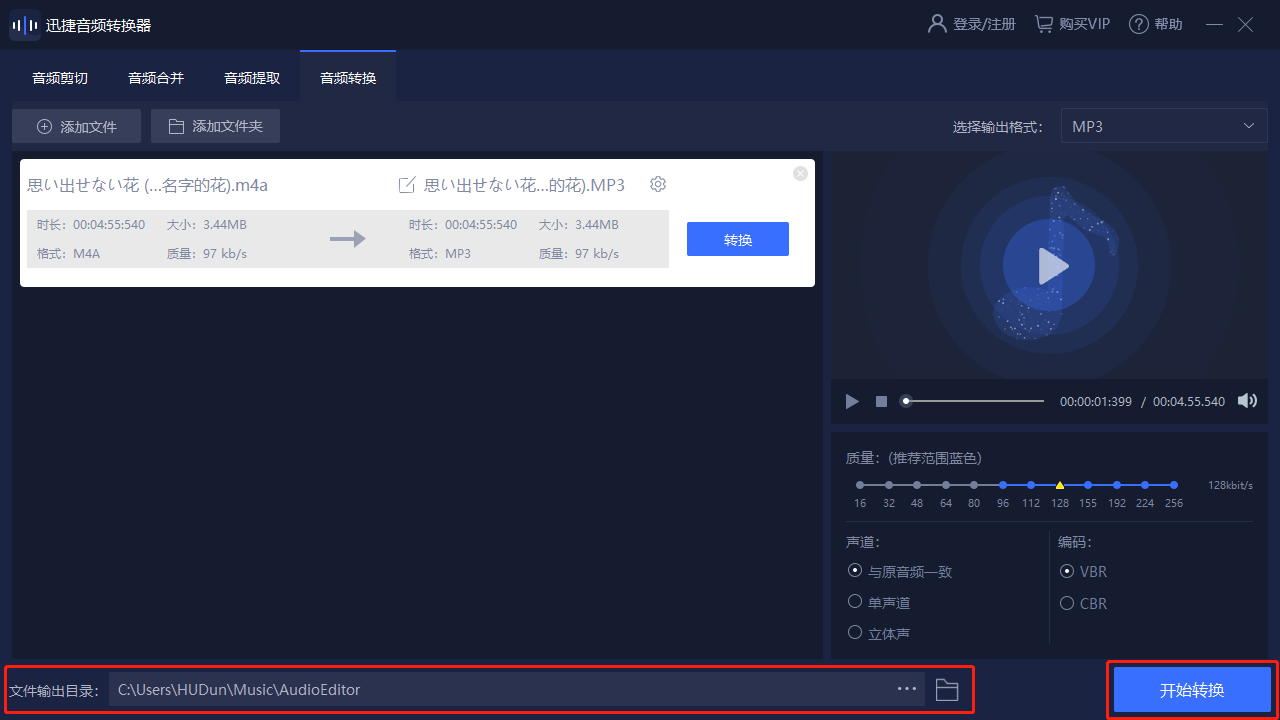將以上的音頻轉(zhuǎn)換準(zhǔn)備工作完成后,我們就可以選擇【文件輸出目錄】,自主選擇文件的保存位置。選擇完成后,點(diǎn)擊【開始轉(zhuǎn)換】就可以了。