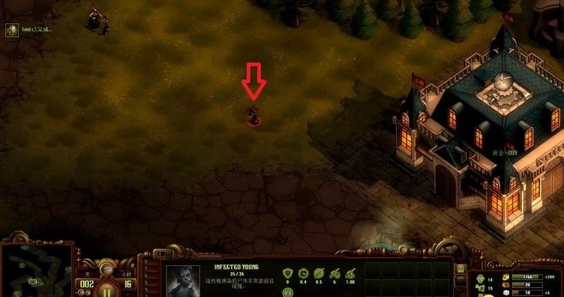 箭頭所示的僵尸也會很快到來,初期靠開局自帶的部隊就能搞定,不過要隨時保持關注(查看小地圖紅點)。