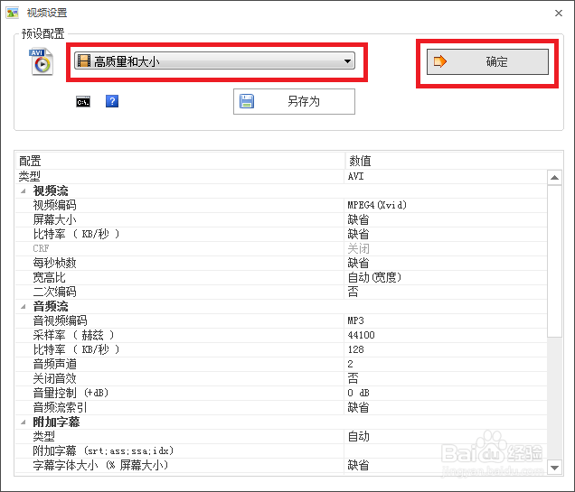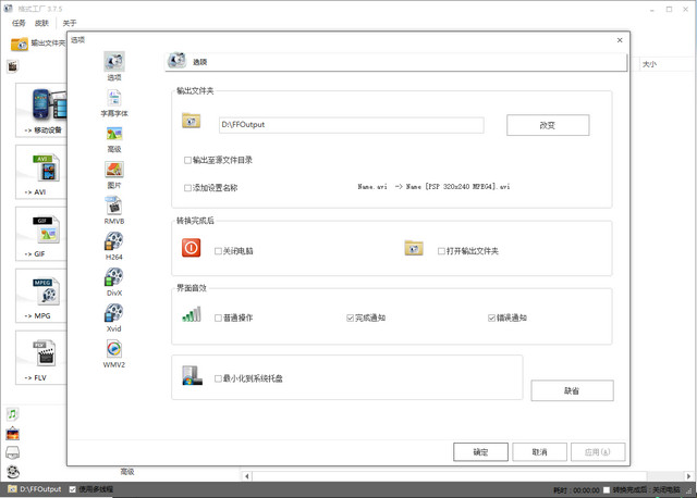 可設(shè)置文件輸出配置(包括視頻的屏幕大小,每秒幀數(shù),比特率,視頻編碼;音頻的采樣率,比特率;字幕的字體與大小等)。
