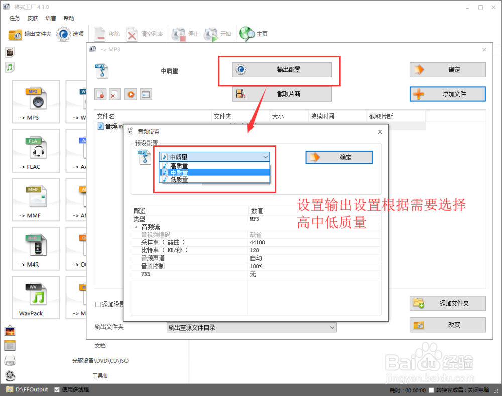 打開音頻之后,單擊“輸出設(shè)置”這個(gè)按鈕,來選擇設(shè)置輸出的選項(xiàng),這里一般根據(jù)一個(gè)需求來選擇高中低質(zhì)量的輸出。