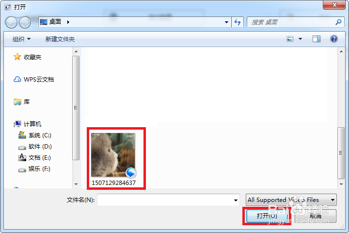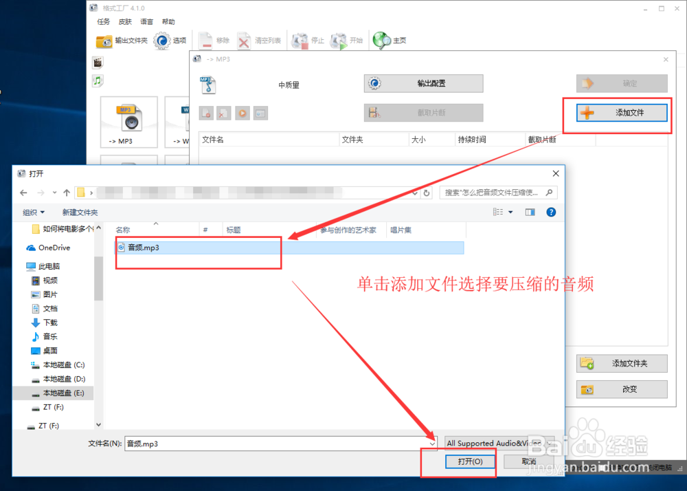 在打開的窗口的選擇點(diǎn)擊“添加文件”命令按鈕,彈出打開對(duì)話窗口,在打開對(duì)話窗中找到我們的音頻并選中打開。