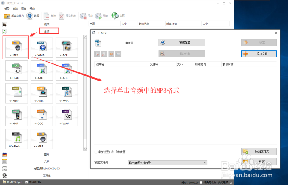 在左側(cè)格式中選擇音頻這個(gè)大選項(xiàng),然后在音頻大選項(xiàng)中選擇“MP3”這個(gè)格式。打開轉(zhuǎn)換MP3格式窗口。