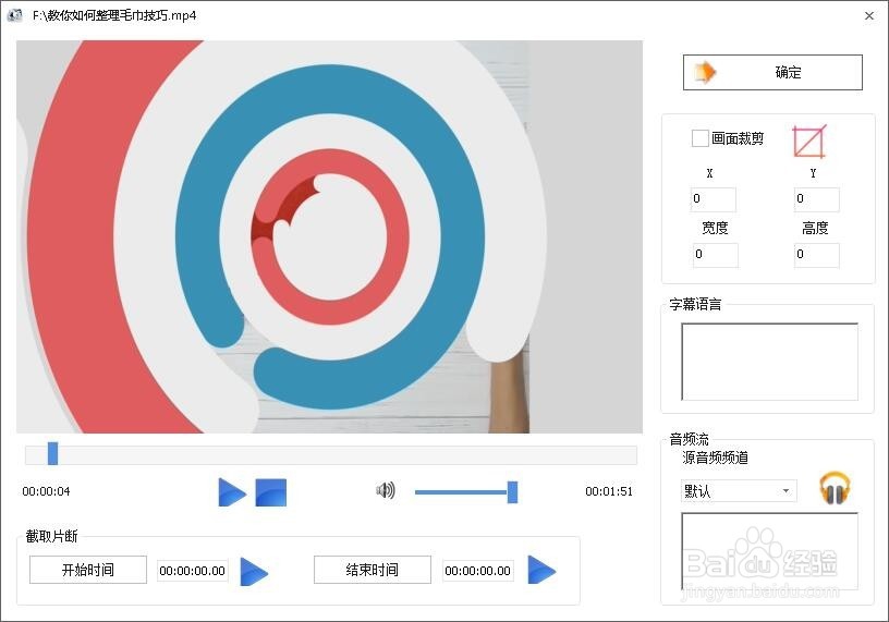 4、你可以通過兩種方式來剪輯視頻,方法一:如下圖所示,在界面下方有開始時(shí)間和結(jié)束時(shí)間兩個(gè)選項(xiàng),我們可以自行填寫好開始時(shí)間和結(jié)束時(shí)間,填寫完成后就可以進(jìn)行剪輯了。方法二:點(diǎn)擊時(shí)間軸選需要剪輯的位置,然后點(diǎn)擊【開始時(shí)間】選擇好開始時(shí)間,再點(diǎn)擊時(shí)間軸選好結(jié)束時(shí)間點(diǎn)擊【結(jié)束時(shí)間】,然后剪輯位置就選好了, 最后點(diǎn)擊確定。