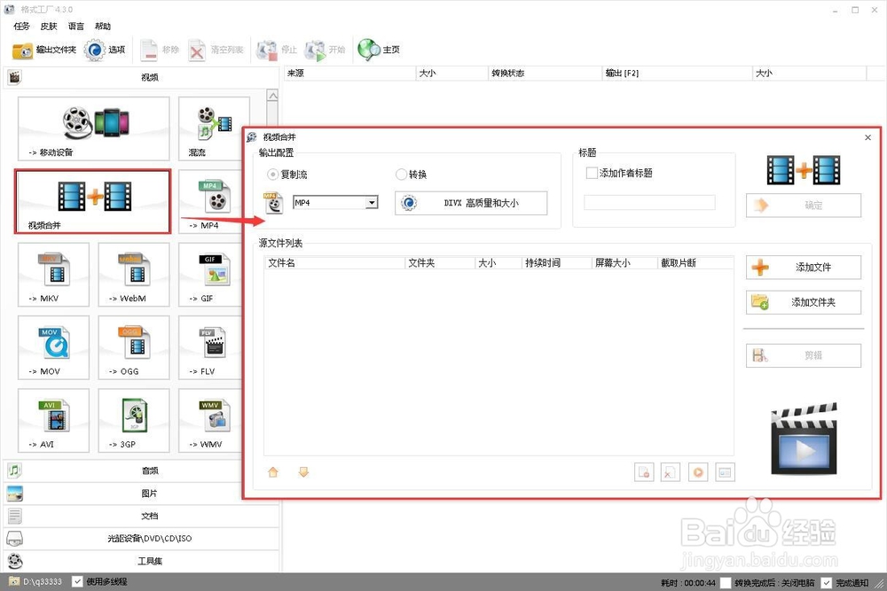 點(diǎn)擊添加文件,將需要合并的視頻添加到隊(duì)列