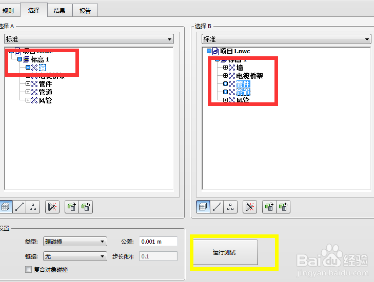 在選擇中分別選擇要碰撞的類型,例如左側(cè)為墻,右側(cè)為管道管件構(gòu)件,然后點(diǎn)擊下方的運(yùn)行測試