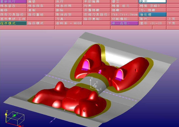 殘料加工功能可清除前一把(大的)刀具不能進(jìn)入的區(qū)域,在加工的特征來(lái)源與對(duì)幾何形狀的分析的基礎(chǔ)上,對(duì)不同的特征實(shí)施合適的加工策略。殘料加工包括:清根和筆式加工。清根能對(duì)零件進(jìn)行區(qū)域識(shí)別和計(jì)算,自動(dòng)檢測(cè)需要清根的區(qū)域,并對(duì)垂直區(qū)域和平坦區(qū)域的清根采用不同的加工策略。對(duì)平坦區(qū)域采用沿零件拐角的輪廓式清根,對(duì)垂直區(qū)域采用等高線式清根。這在前道工序留有較大余量的情況下,實(shí)現(xiàn)了具有針對(duì)性的加工策略,有效地保護(hù)了刀具,保證了加工結(jié)果的優(yōu)良性。