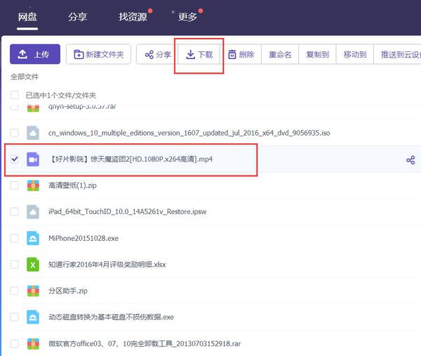3、等待文件下載完成之后,在網盤中找到該文件,點擊頂部“下載”按鈕;
