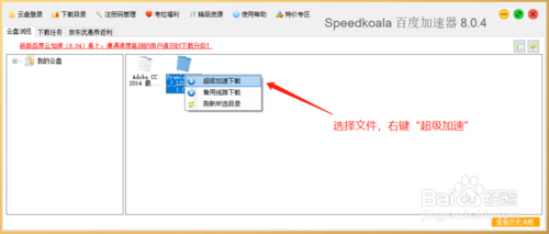 登陸后,軟件內會出現(xiàn)網盤內容,選擇文件,右鍵“超級加速”,然后選擇下載路徑,注意,如果在使用期間,發(fā)現(xiàn)速度開始變慢,請選擇“備用線路”,目前只有Speedkoala提供備用線路。