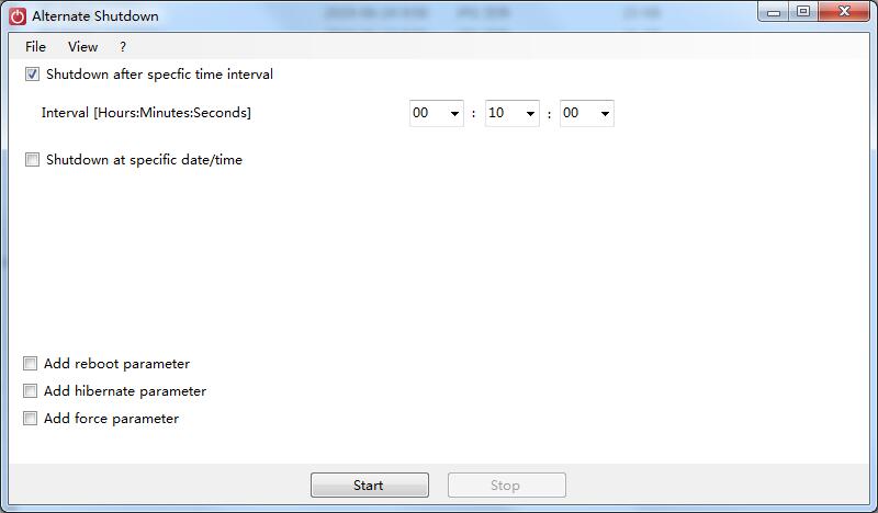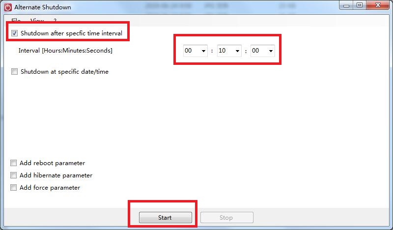 1、安裝后打開本軟件,然后點擊Shutdown after specific time interval就是倒計時關機選項,設定好時:分:秒 后再按下底部的 [Start] 按鈕,開始倒數(shù)計時后關機。