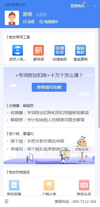 為了更好的幫助您進行“自然人稅收管理系統(tǒng)扣繳客戶端”申報,推出“個稅服務中心”,主要提供以下服務:1)智能在線咨詢/常見問題