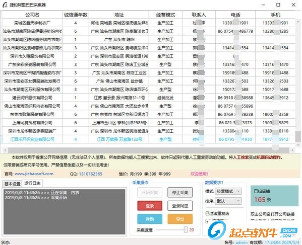 2、軟件可以采集到商家公司名、誠(chéng)信通年數(shù)、地址、經(jīng)營(yíng)模式、聯(lián)系人、電話號(hào)碼、手機(jī)號(hào)碼等。