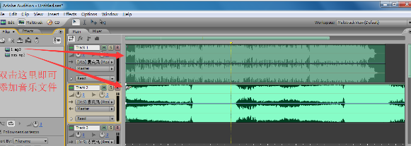 2、打開后在下圖位置雙擊鼠標左鍵即可添加音樂,將我們想要合并的音樂添加進來。添加完畢后將它們按順序拖動到右邊的音軌(Track)中(這里以兩首音樂舉例):