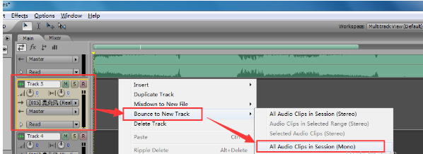 3、接著我們在第三軌道中點擊鼠標右鍵,選擇“Bounce to New Track”→“All Audio Clips in Session(Stereo)”,如下圖所示: