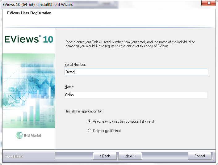 4、設(shè)置完EViews的安裝目錄后進(jìn)入到信息填寫界面,在這位置小編為大家提供填寫信息供大家測試使用。如: