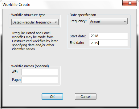 2、開始創(chuàng)建后進(jìn)入到EViews的Wordkfile工作文件設(shè)置界面,我們選擇在 “start date” 處輸入起始時間,“End date” 處輸入截止時間。如下: