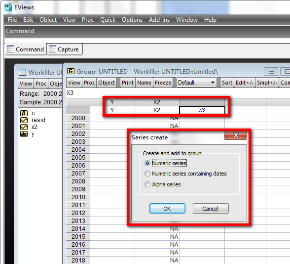 5、然后依次輸入每列相應(yīng)的名字即可,創(chuàng)建過程中出現(xiàn)彈框直接選擇“Numerical Series”選項即可。