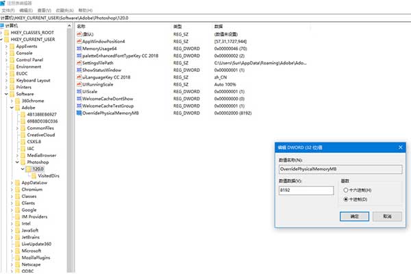 三、Win+R鍵盤,在“運行”窗口輸入“Regedit”,打開注冊表編輯器,找到計算機——HKEY_CURRENT_USER——Sofrware——Adobe——Photoshop——120.0,新建DWORD(32)位值,數(shù)據(jù)名稱為:OverridePhysicalMemoryMB,數(shù)值數(shù)據(jù)為2000,基數(shù)選擇十進制,確定!