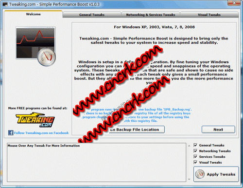 Simple Performance Boost一個號稱能讓windows跑得更快更好的系統(tǒng)優(yōu)化及設置調(diào)整軟件。軟件內(nèi)置了大量安全的優(yōu)化設置選項,每項都對系統(tǒng)性能提速有一定作用,對于無經(jīng)驗用戶,可以一路點擊next和apply輕松完成優(yōu)化。如果希望恢復原樣,點擊界面上的open backup按鈕,導入軟件自動備份的原始注冊表文件即可。