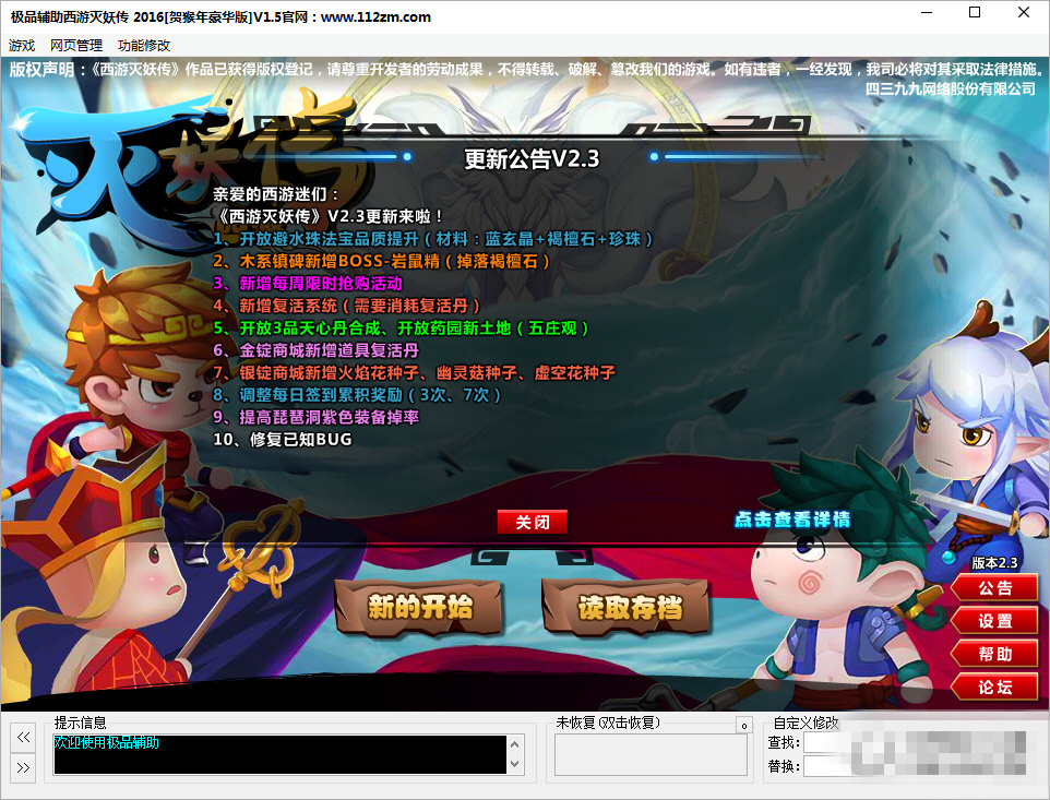 西游滅妖傳極品輔助2016V1.3[更新] 5項(xiàng) [修復(fù)]0項(xiàng) [刪除]0項(xiàng) [菜單]0項(xiàng)
