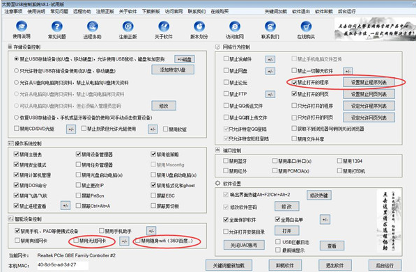 1、大勢至usb端口控制軟件新增了對當前流行的“隨身wifi”的禁用(可以教你怎么禁用360wifi、完全屏蔽360隨身wifi),可以有效防止員工在電腦的USB接口隨意插各種“隨身wifi”或網(wǎng)絡(luò)熱點,從而為自己的筆記本電腦、手機、平板提供上網(wǎng)功能,處理私人事情或上網(wǎng)娛樂的行為。目前可以完全限制360wifi接入、禁止百度隨身wifi、限制網(wǎng)易隨身wifi等。2、新增了“禁止安裝軟件”、“禁止運行程序”的功能,以及“禁止訪問網(wǎng)址”(黑名單)的功能。通過本功能,可以完全禁止電腦安裝或運行特定軟件的功能;可以禁止電腦訪問特定網(wǎng)址的功能,見上圖。
