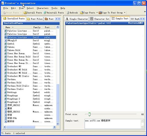 檔案總管般的操作方式讓使用者更方便管理,而且也可以將各種字型分門別類 (font group);在字型的反安裝方面也提供多項(xiàng)的選擇,可以復(fù)制、移動(dòng)、刪除…等。如果你常常為安裝新字型而煩惱的話,Printer's Apprentice 算是一套蠻不錯(cuò)的字型管理工具程序喔!