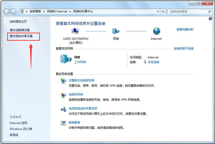 6、進(jìn)入“網(wǎng)絡(luò)和共享中心”選擇“更改共享高級設(shè)置”
