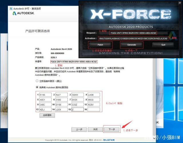 20、把申請?zhí)枏椭频阶詸C里面的Request中(記得刪除原Request中的內容),先點擊Patch然后點擊確定,再點擊Generate后復制Activation中生成的激活碼,然后粘貼激活碼至我具有Autodesk提供的激活碼方框中,最后點擊下一步即可。(提示:復制和粘貼的時候只能用快捷鍵“Ctrl+C”和“Ctrl+V”)詳見下圖: