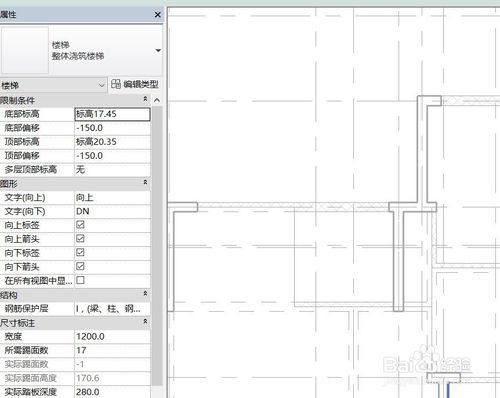 上述操作之后,軟件屬性欄會彈出樓梯的屬性內容,讀者需要根據自身需要定義樓梯屬性。下圖是筆者根據CAD電子圖信息定義的樓梯屬性。
