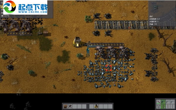 來到一片廢棄的礦場,幾部采掘機正在工作,這里介紹熱能機械臂(某中文版譯為燃料插件)的功能,它能夠自動收集采集的資源,并能往采掘機里填裝燃料。打開地上的箱子,從里面找到手槍和彈夾,還有傳送帶、機械手。
