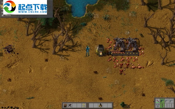 現(xiàn)在要調(diào)查東邊的殘骸,那邊有兩只小型沙蟲和蟲巢核心,小型沙蟲會拋擲攻擊,蟲巢那里不斷的有蟲子朝主角攻擊,所以不能貿(mào)然接近它們,而是在地上擺放炮塔并填裝此前制造的棘輪彈盒,再用快捷欄里的新道具-石墻將它們保護起來,讓它們自動清掃沖擊過來的蟲群,而主角不必忙于戰(zhàn)斗,只是輕巧的奔跑躲閃就可以了。